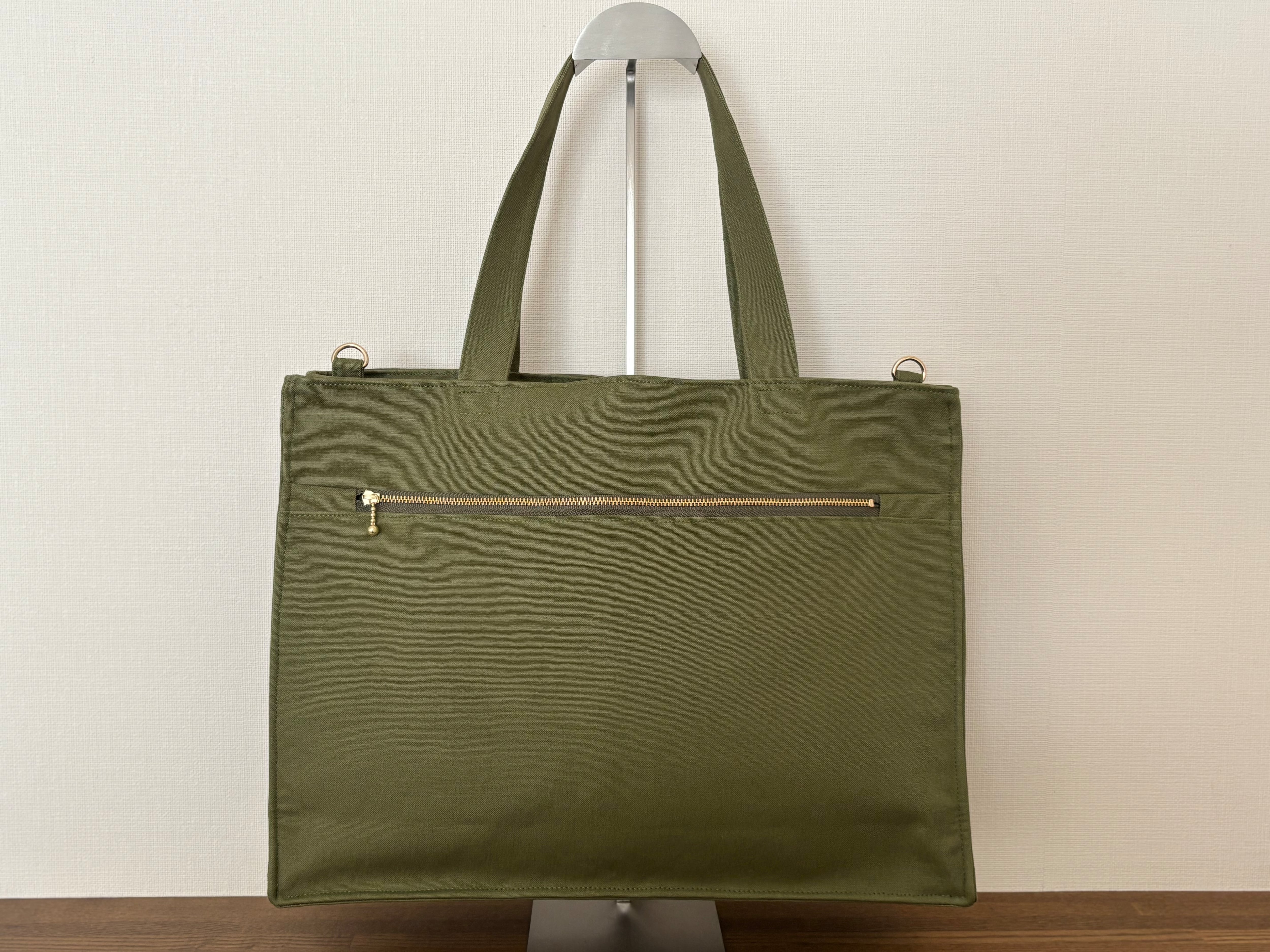 適度な柔らかさとハリ感のある丈夫で機能的な11号帆布の大きな四角いトートバッグです。