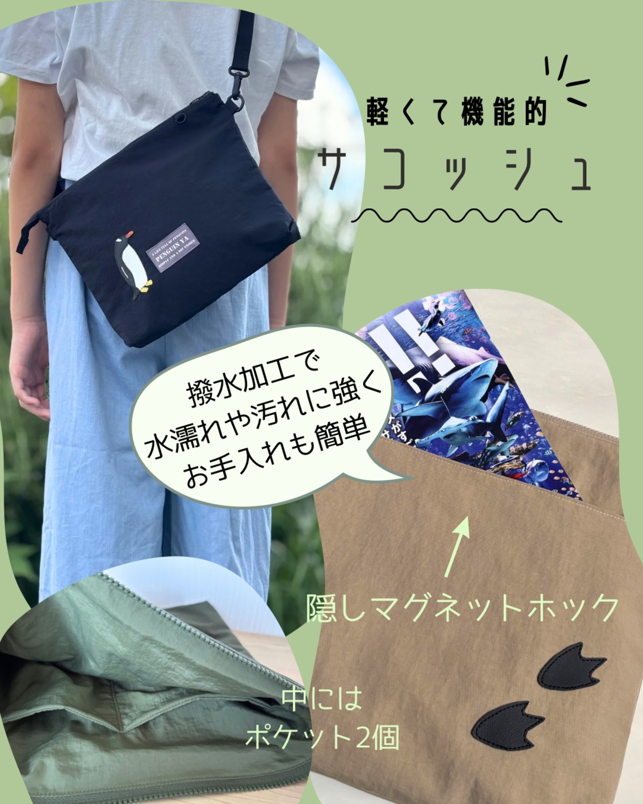 軽量で多少の水濡れにも強いので、日常使いだけでなくレジャーやちょっとしたお出かけにもピッタリです(※完全防水ではありません)。