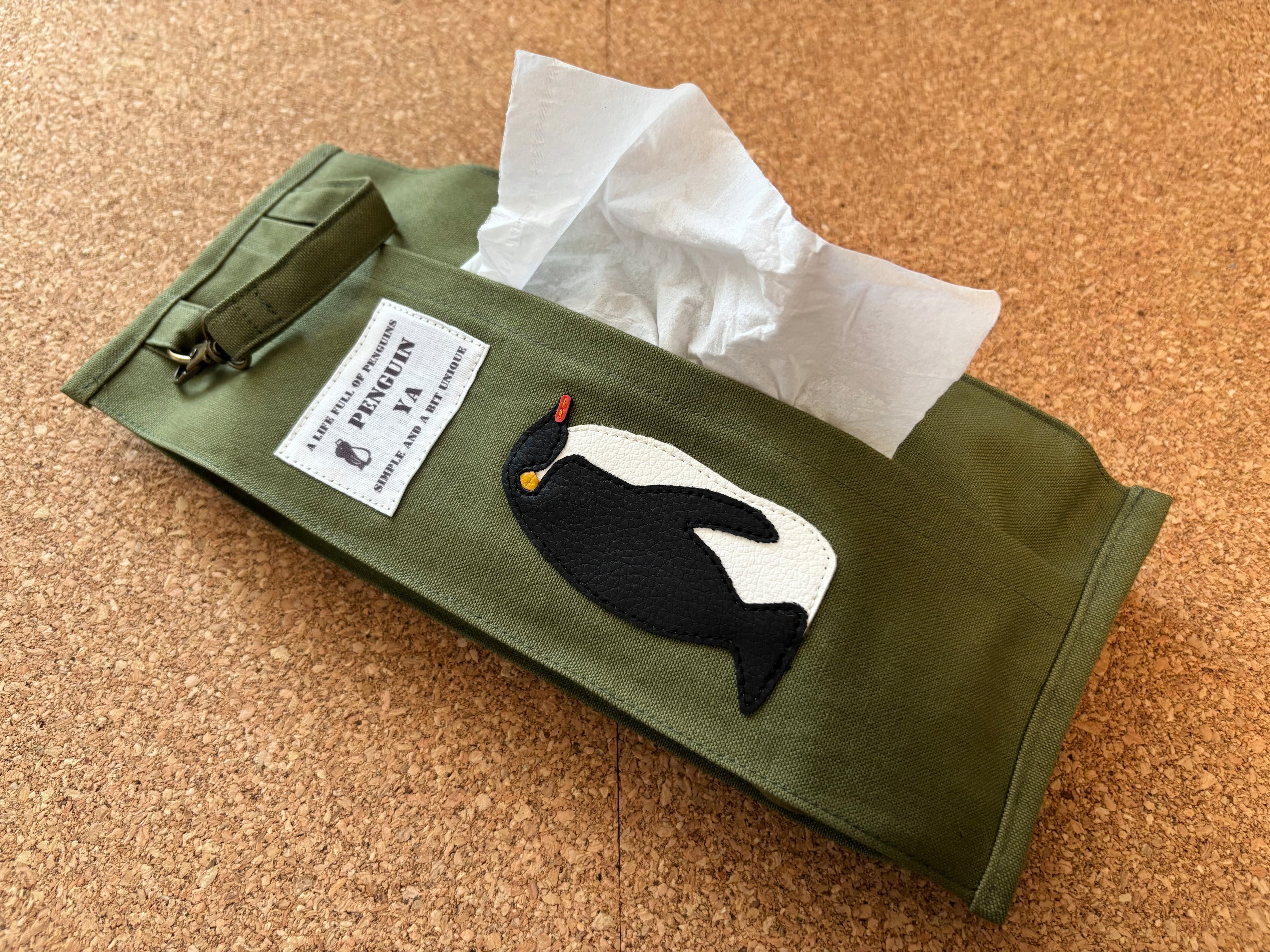 コウテイペンギンのループ付きティッシュケースです。